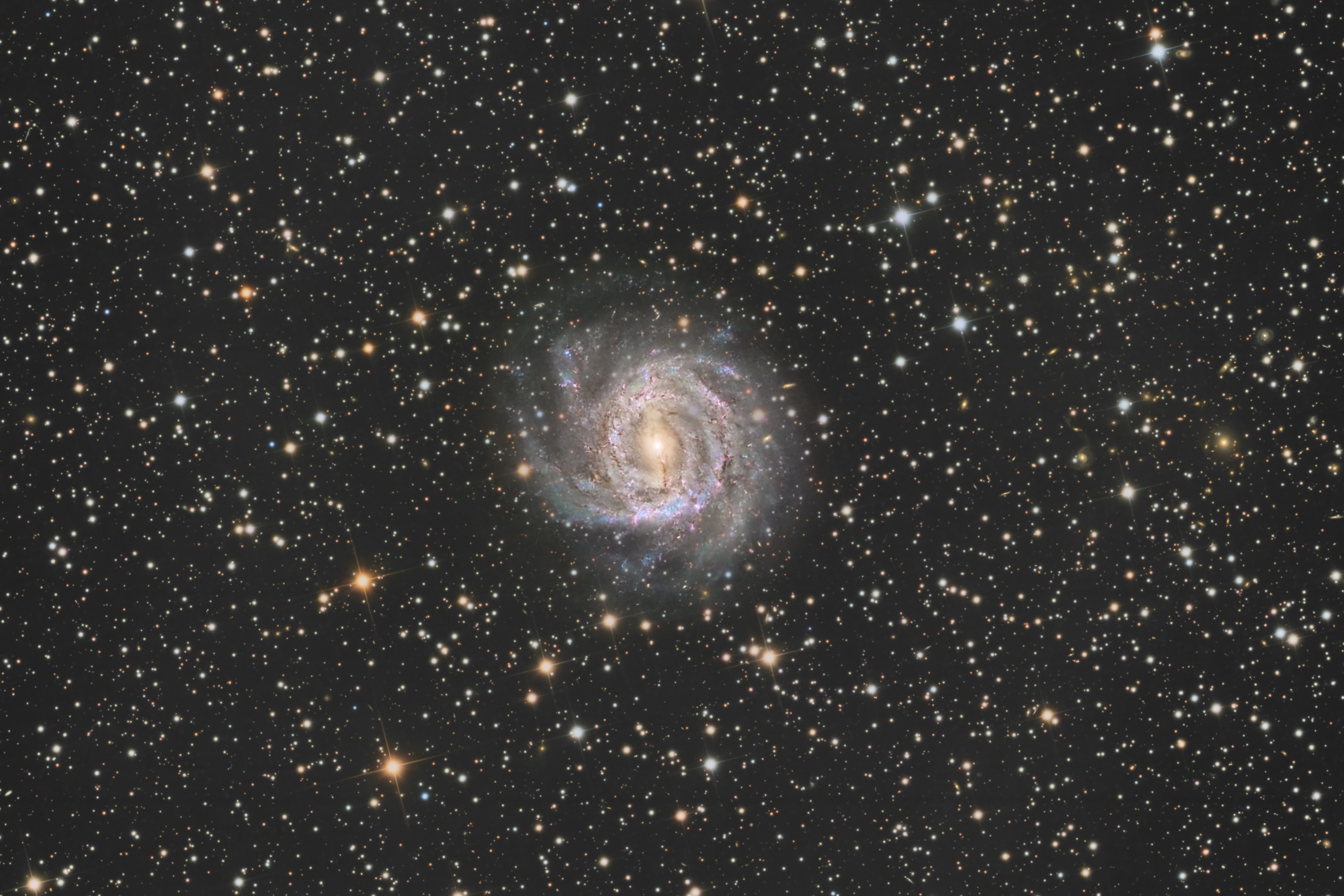 NGC 5643 est une magnifique galaxie spirale barrée nichée dans la constellation australe du Loup, un objet céleste qui a été initialement catalogué par l'astronome écossais James Dunlop en 1826. Située à une distance estimée à environ 37 millions d'années-lumière, elle se distingue par sa structure physique : elle présente une barre centrale proéminente traversant son bulbe, et ses bras spiraux sont asymétriques et floconneux, révélant de multiples pouponnières stellaires où les étoiles naissent activement. Ce qui rend NGC 5643 particulièrement fascinante est son statut de galaxie de Seyfert de type 2. Cela signifie qu'elle est une galaxie active, avec un noyau extrêmement lumineux (AGN) dont l'énergie est principalement émise dans l'infrarouge lointain. Cette activité est alimentée par un trou noir supermassif en son cœur, dont la masse est estimée à plusieurs millions de fois celle du Soleil. Le système est également le théâtre de phénomènes transitoires importants, comme l'observation en 2013 de la supernova de type Ia, SN 2013aa, faisant de NGC 5643 un laboratoire cosmique essentiel pour l'étude de l'évolution galactique.