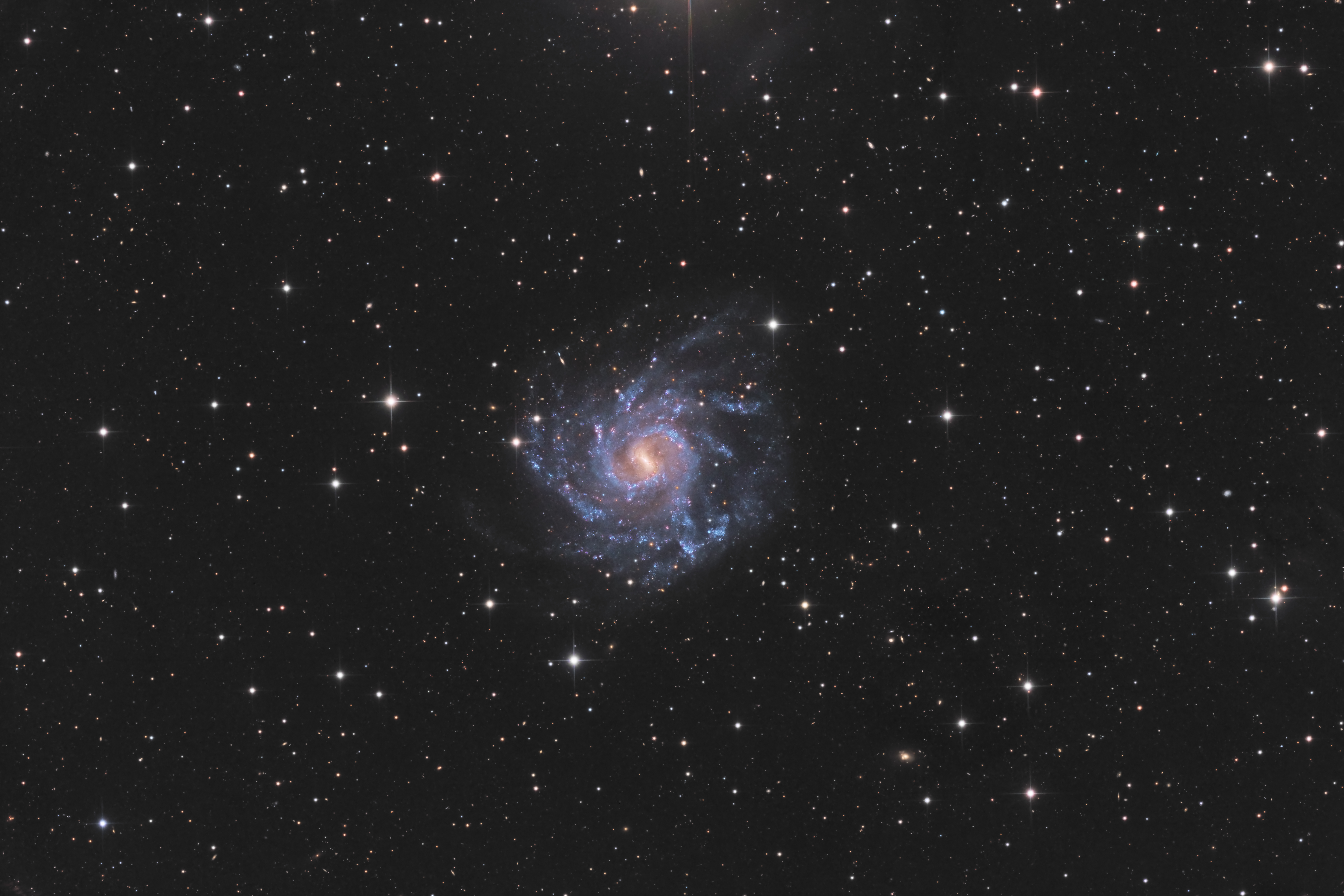 NGC 7424 est une galaxie spirale intermédiaire (barrée?) relativement rapprochée située dans la constellation de la Grue. Sa vitesse par rapport au fond diffus cosmologique est de 682 ± 17 km/s, ce qui correspond à une distance de Hubble de 10,1 ± 0,8 Mpc (∼32,9 millions d'al). NGC 7424 a été découverte par l'astronome britannique John Herschel en 1834. La classe de luminosité de NGC 7424 est III-IV et elle présente une large raie HI. En raison d'une brillance de surface égale à 15,22 mag/am2, on peut qualifier NGC 7424 de galaxie à faible brillance de surface (LSB en anglais pour low surface brightness). Les galaxies LSB sont des galaxies diffuses (D) avec une brillance de surface inférieure de moins d'une magnitude à celle du ciel nocturne ambiant. À ce jour, cinq mesures non basées sur le décalage vers le rouge (redshift) donnent une distance de 9,312 ± 1,787 Mpc (∼30,4 millions d'al), ce qui est à l'intérieur des valeurs de la distance de Hubble.