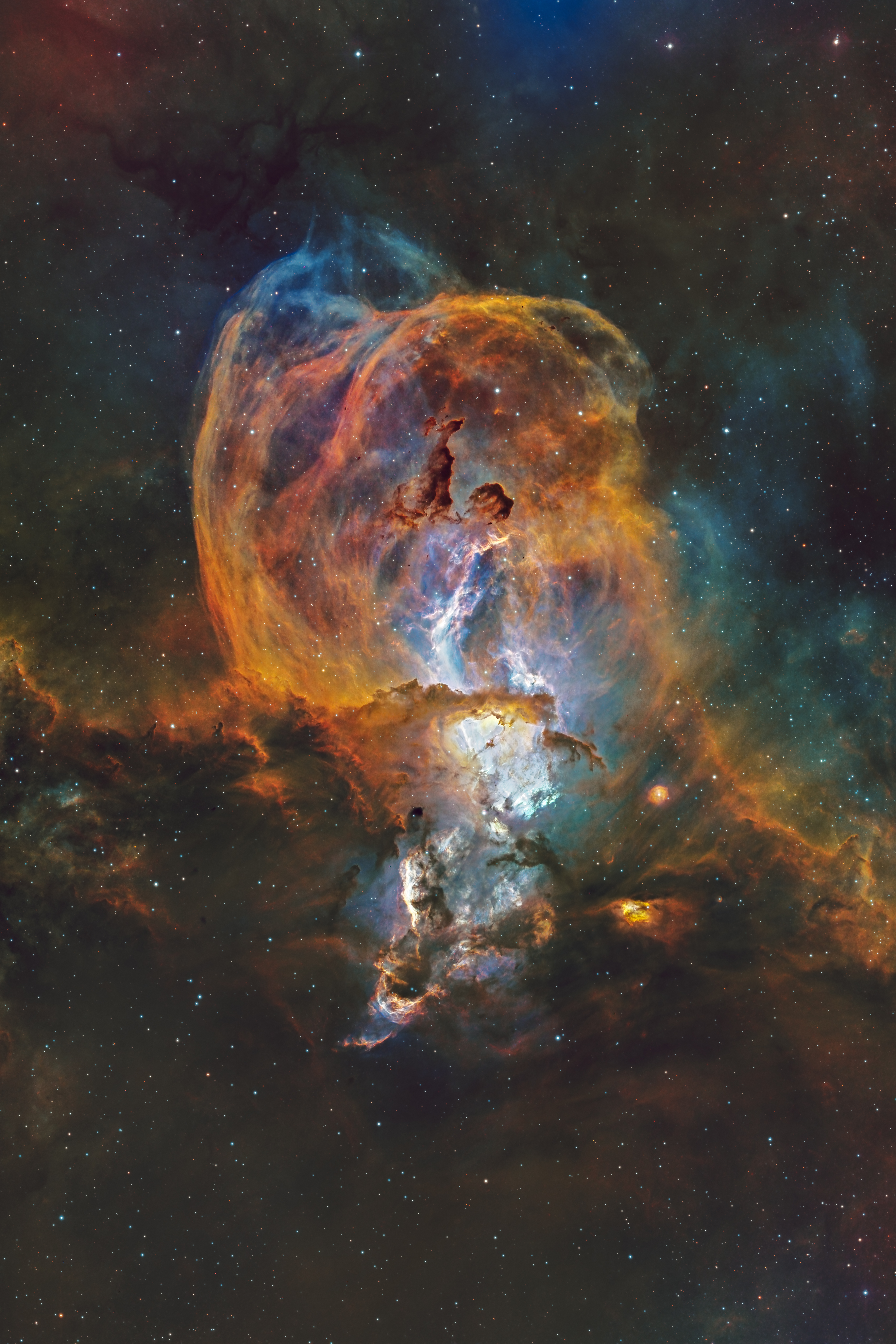 NGC 3576 est une nébuleuse en émission située dans la constellation de la Carène. Elle a été découverte par l'astronome britannique John Herschel dans les nuits du 14 et du 16 mars 1834. En réalité, Herschel a cru observer six objets différents à l'aide de ses instruments et c'est pour cette raison que cette nébuleuse a reçu six numéros différents dans le New General Catalog soit NGC 3576, NGC 3579, NGC 3581, NGC 3582, NGC 3584 et NGC 3586. De nos jours, les astronomes nomment habituellement NGC 3576 la nébuleuse entière. On lui a donné le surnom de nébuleuse de la Statue de Liberté en raison de la forme centrale de celle-ci. Ce surnom lui a été donné par Steve Mazlin du Star Shadows Remote Observatory (SSRO). Cette forme centrale est plus évidente sur l'image publiée sur le site du SSRO. Liste des objets du NGC (en) NGC 3576 sur la base de données NASA/IPAC Extragalactic Database (en) NGC 3576 sur la base de données Simbad du Centre de données astronomiques de Strasbourg.