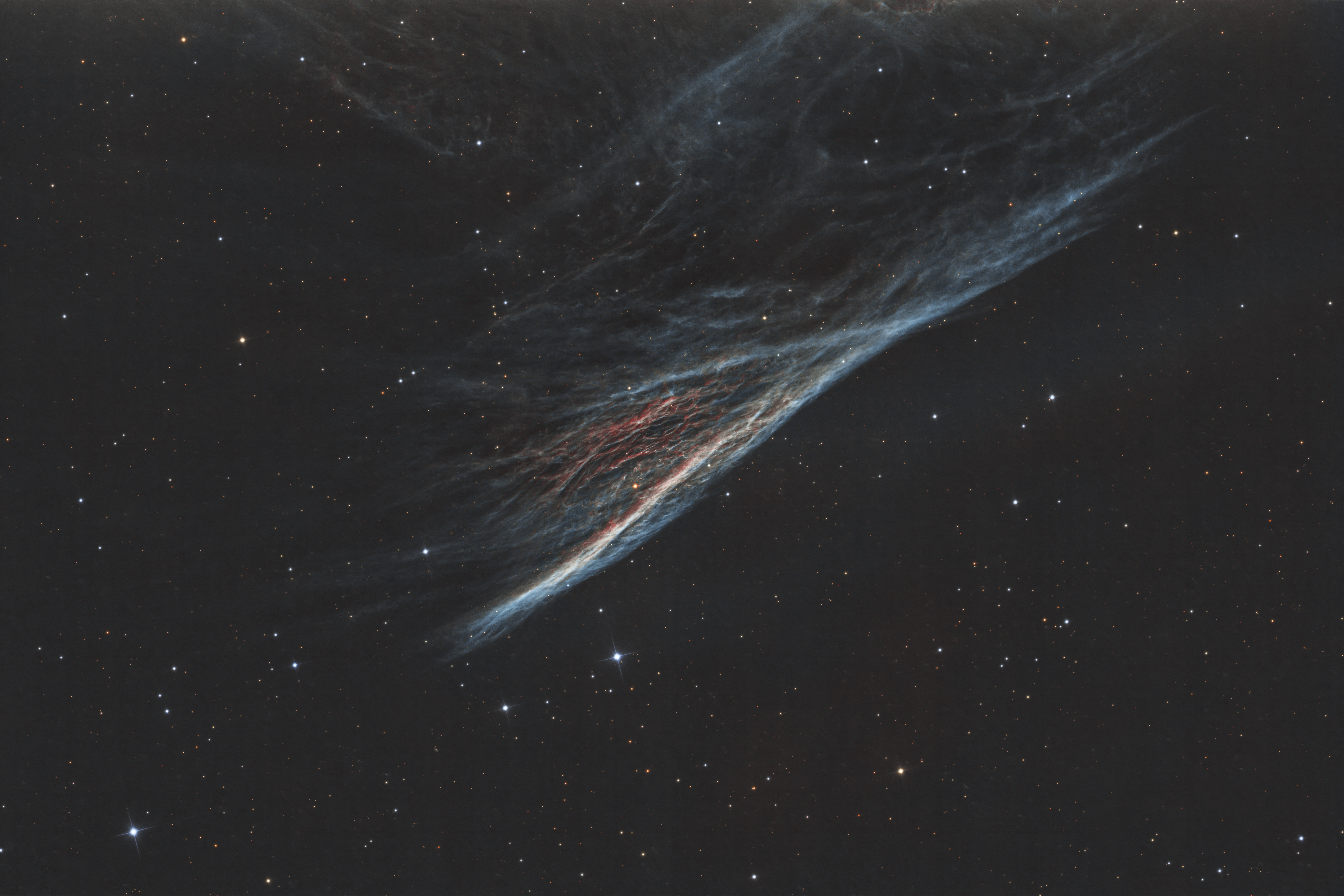 La Nébuleuse du Crayon, officiellement cataloguée sous le nom de NGC 2736, est un fascinant rémanent de supernova, un témoignage spectaculaire d'une étoile massive ayant explosé. Découvert en 1835 par l'astronome John Herschel, cet objet céleste se situe à environ 815 années-lumière de la Terre dans la constellation des Voiles. La nébuleuse elle-même n'est qu'une petite partie, d'une longueur d'environ cinq années-lumière, du vaste rémanent des Voiles, dont l'origine remonte à une supernova qui aurait explosé il y a environ 11 000 ans. L'explosion fut si puissante qu'elle laissa derrière elle le pulsar des Voiles et aurait été 250 fois plus lumineuse que Vénus, visible même en plein jour. La structure filamenteuse de la nébuleuse est créée lorsque l'onde de choc initiale de la supernova percute des régions de gaz interstellaire. Cette collision comprime et chauffe le gaz à des millions de degrés avant qu'il ne se refroidisse et n'émette de la lumière. Les couleurs observées révèlent la température du gaz: le bleu indique la présence d'oxygène fortement ionisé et très chaud, tandis que le rouge provient d'atomes d'hydrogène plus froids. Malgré son âge, la Nébuleuse du Crayon continue de se déplacer dans l'espace à une vitesse encore impressionnante d'environ 640 000 kilomètres par heure.
