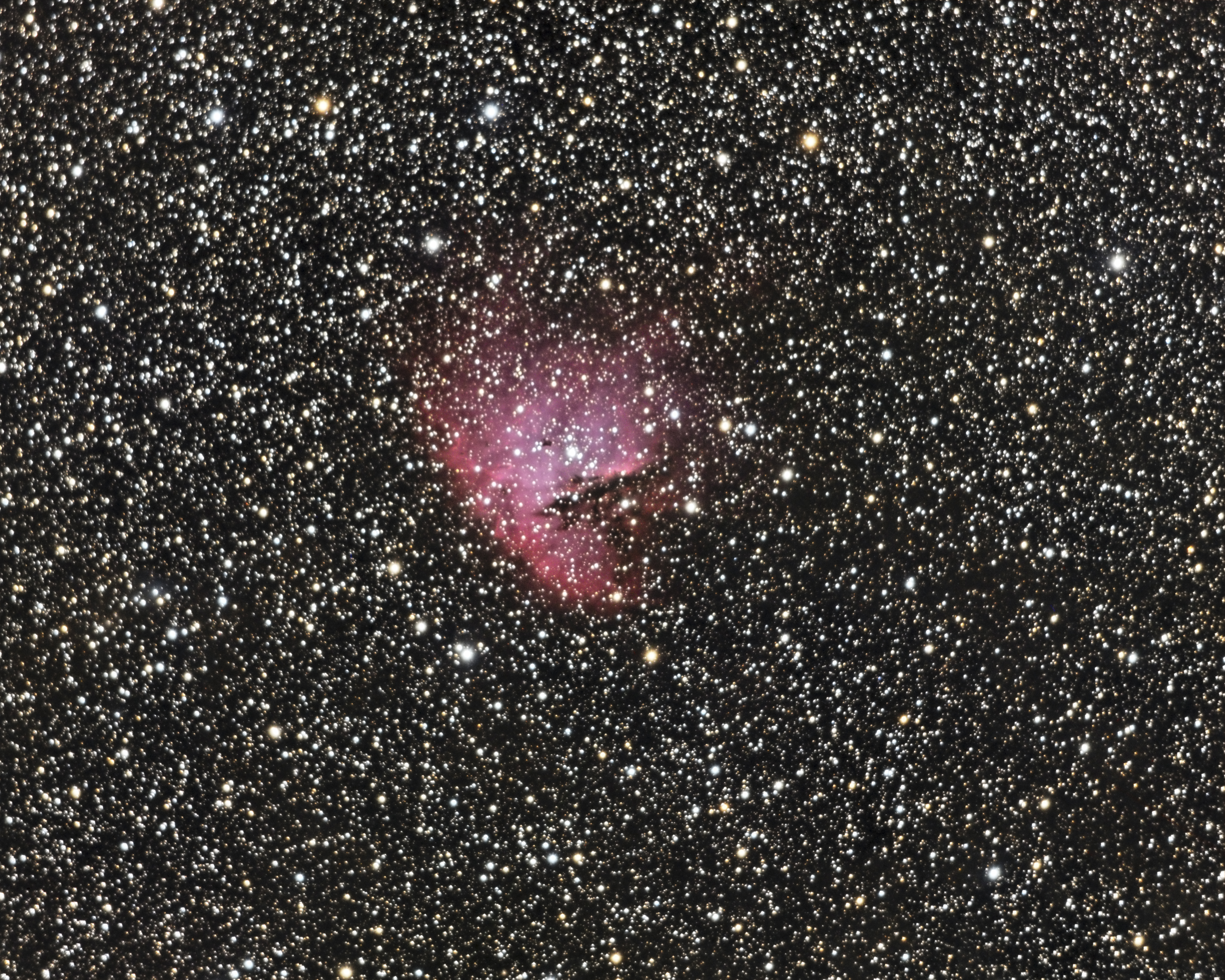NGC 281 est une région HII située à environ 10 000 années-lumière de la Terre dans la constellation de Cassiopée. D'un diamètre d'environ 100 années-lumière, elle fait partie du bras de Persée. Elle inclut ou est proche de l'amas ouvert IC 1590 (en), l'étoile double HD 5005 et plusieurs globules de Bok. Elle est visible dans un télescope amateur dans les zones où le ciel nocturne est suffisamment sombre. Elle est parfois officieusement appelée nébuleuse Pacman à cause de sa ressemblance fortuite au héros éponyme du jeu d'arcade Pac-Man. Cette nébuleuse en émission a été découverte par l'astronome américain Edward Barnard en 1881. Barnard a probablement observé la même nébuleuse en 1890 et elle a été plus tard inscrite au catalogue IC sous la cote IC 11. = Liste des objets du NGC IC 1590 (pl) Région HII = Très belle image de NGC 281 sur le site Astronomy Picture of the Day.